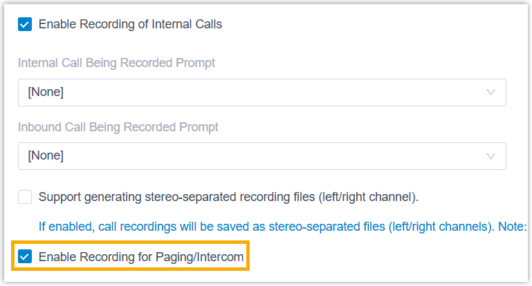 - Optional: Aktivieren Sie das Kontrollkästchen „ Aufzeichnung interner Anrufe aktivieren“ , um interne Anrufe automatisch aufzuzeichnen.