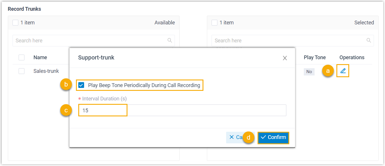neben einen ausgewählten Stamm. - Im Popup-Fenster aktivieren Sie das Kontrollkästchen „ Während der Anrufaufzeichnung regelmäßig einen Signalton abspielen“ .