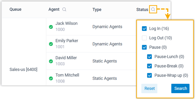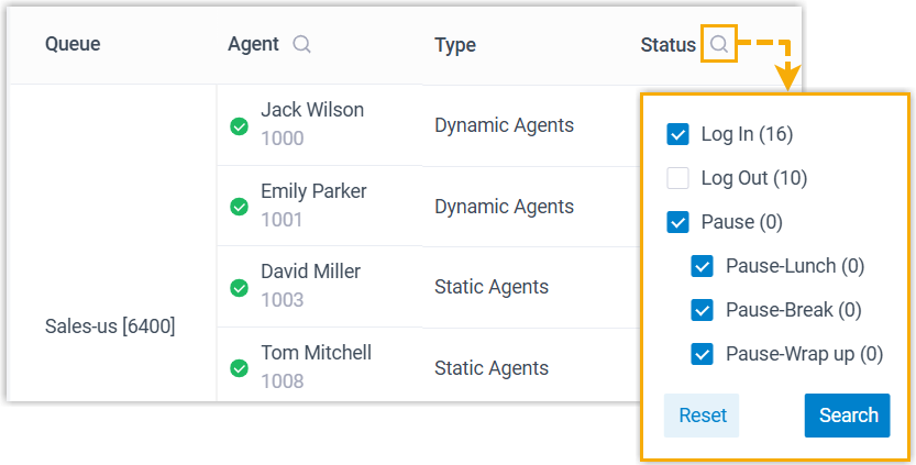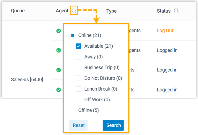 Verfolgt den Präsenzstatus der Agenten, den An- und Abmeldestatus, Anrufstatistiken und mehr in einer klaren, organisierten Listenansicht.