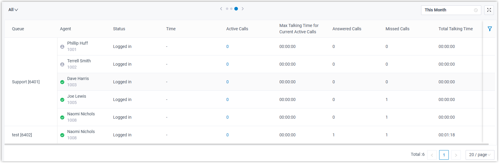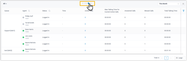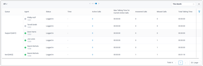 Ermöglicht die Verfolgung von Präsenzstatus, An-/Abmeldestatus und Anrufstatistiken der Agenten in einer organisierten Liste.