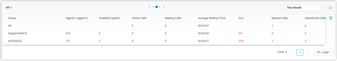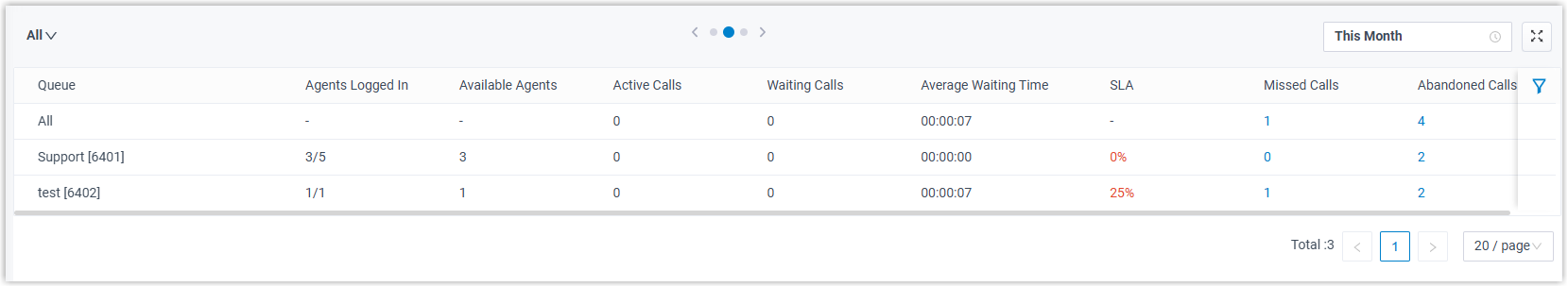 Zeigt die Gesamtzahl der verpassten Anrufe im Zeitraum an. Hinweis: Sie können auf das Widget klicken, um die zugehörigen Anrufprotokolle der Warteschlange anzuzeigen und deren Bearbeitungsstatus zu verwalten. Alle anderen Agenten, die zur Einsicht in die Anrufprotokolle der Warteschlange berechtigt sind, können die von Ihnen vorgenommenen Änderungen in ihren Linkus-Clients sehen. |