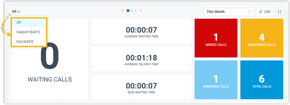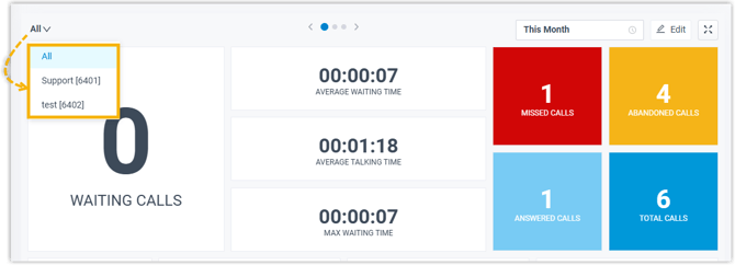 | BEANTWORTETE ANRUFE | Zeigt die Gesamtzahl der beantworteten Anrufe im Zeitraum an. |