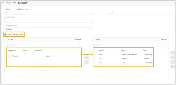 Erlaubte Nebenstellen: Die Anrufer können die ausgewählten Nebenstellen wählen.