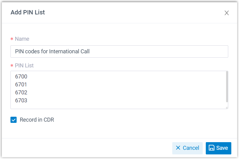 - Im CDR speichern : Gibt an, ob der PIN-Code im CDR gespeichert werden soll, wenn er verwendet wurde.