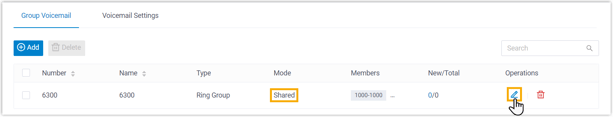 Klicken Sie auf das Bearbeitungssymbol (ein Bleistift-Symbol ist hier gemeint) neben der Gruppen-Voicemail, die Sie bearbeiten möchten.