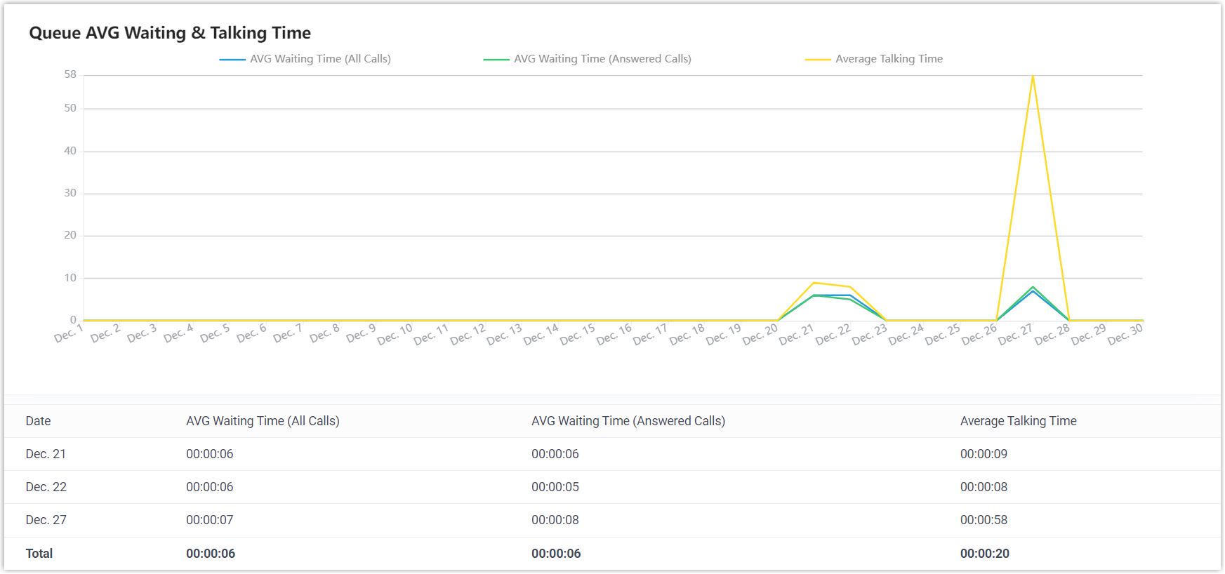 Die durchschnittliche Zeitspanne, die Agenten im Gespräch mit Anrufern verbracht haben. Formel: Gesamte Gesprächszeit / Gesamtzahl der beantworteten Anrufe |