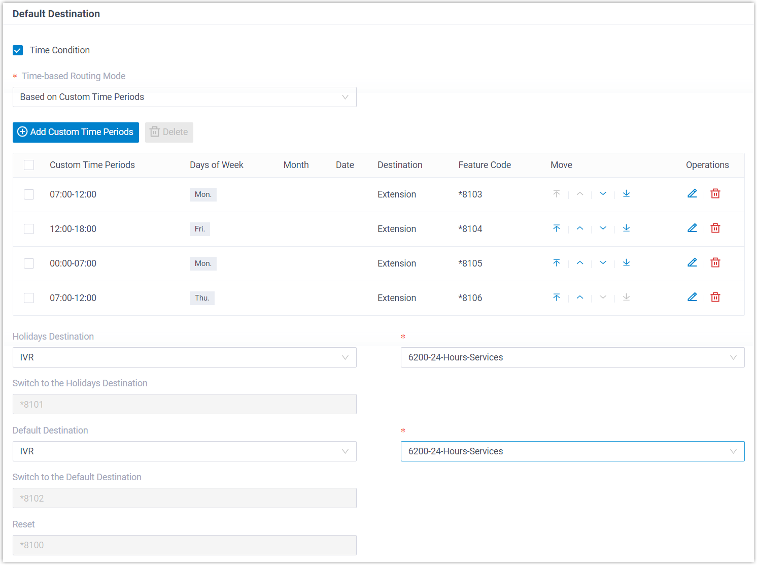 Tipp: Die autorisierten Benutzer können einen spezifischen Feature-Code wählen, um die Zeitbedingung außer Kraft zu setzen und eingehende Anrufe an entsprechende Ziele weiterzuleiten. Weitere Informationen finden Sie unter Zeitbedingung für eingehende Anrufe überschreiben