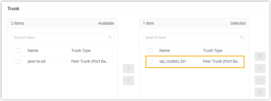 Wählen Sie im Abschnitt Trunk die gewünschten Trunks aus dem Feld Available (Verfügbar) in das Feld Selected (Ausgewählt) aus.