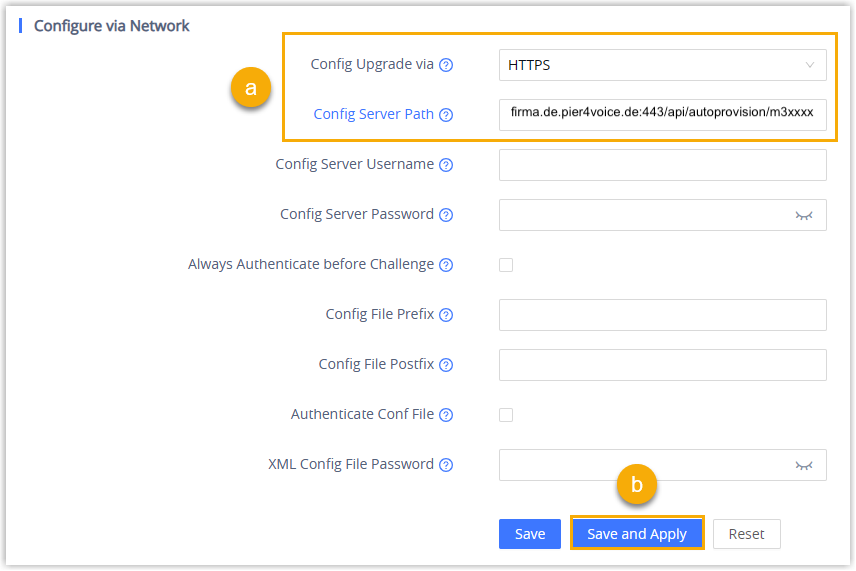 - Konfigurationsserverpfad : Fügen Sie den von der PBX erhaltenen Bereitstellungslink ein.