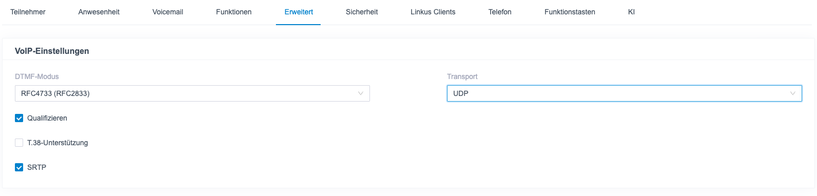 Navigieren Sie zu Extension and Trunk > Extension > [Nebenstelle bearbeiten] > Erweitert > VoIP Einstellung > Transport, und notieren Sie das Transportprotokoll der Nebenstelle. In diesem Beispiel verwendet die Nebenstelle das UDP-Transportprotokoll. Hinweis: Wenn die Nebenstelle das TCP-Transportprotokoll verwendet, stellen Sie sicher, dass der SIP-TCP-Port auf der PBX aktiviert ist, da die Registrierung sonst fehlschlägt (Pfad: PBX-Einstellungen > SIP-Einstellungen > Allgemein > Grundlegend). Wenn die Nebenstelle das TLS-Transportprotokoll verwendet, stellen Sie sicher, dass TLS auf der PBX aktiviert ist, da die Registrierung sonst fehlschlägt (Pfad: PBX-Einstellungen > SIP-Einstellungen > TLS). |