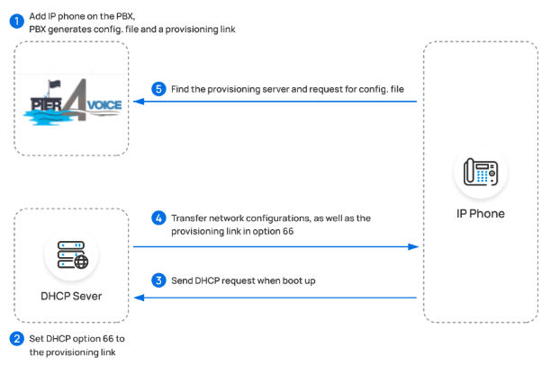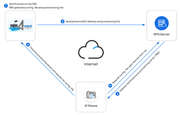 Pier4Voice unterstützt die automatische Provisionierung von IP-Telefonen über RPS- und DHCP-Methoden. Sie können die am besten geeignete automatische Provisionierungsmethode entsprechend der Kompatibilität des IP-Telefons auswählen.
