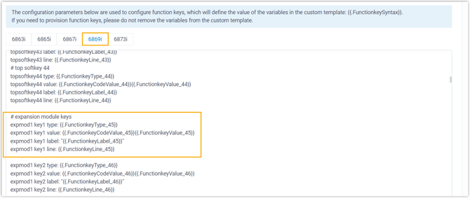 - Im zweiten Textfeld des Abschnitts „Konfigurationsparameter im Textformat anpassen“ wählen Sie das jeweilige Telefonmodell aus und lesen dann in der Dokumentation zu den Konfigurationsparametern des IP-Telefons nach, wie Sie Funktionstasteneinstellungen für das Erweiterungsmodul hinzufügen.