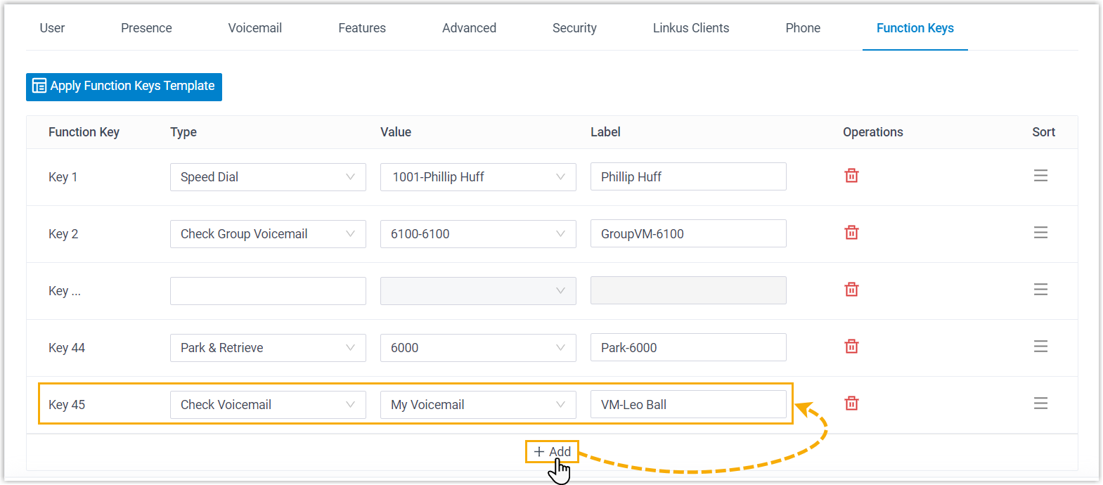 Hinweis:Pier4Voice unterstützt das Hinzufügen von bis zu 120 Funktionstasten auf dem PBX-Webportal.