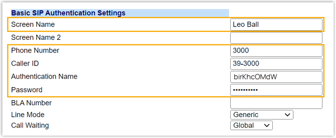 - Geben Sie im Abschnitt „Grundlegende SIP-Authentifizierungseinstellungen“ die Nebenstelleninformationen ein.