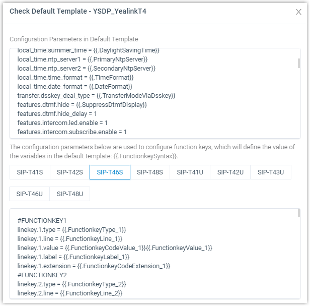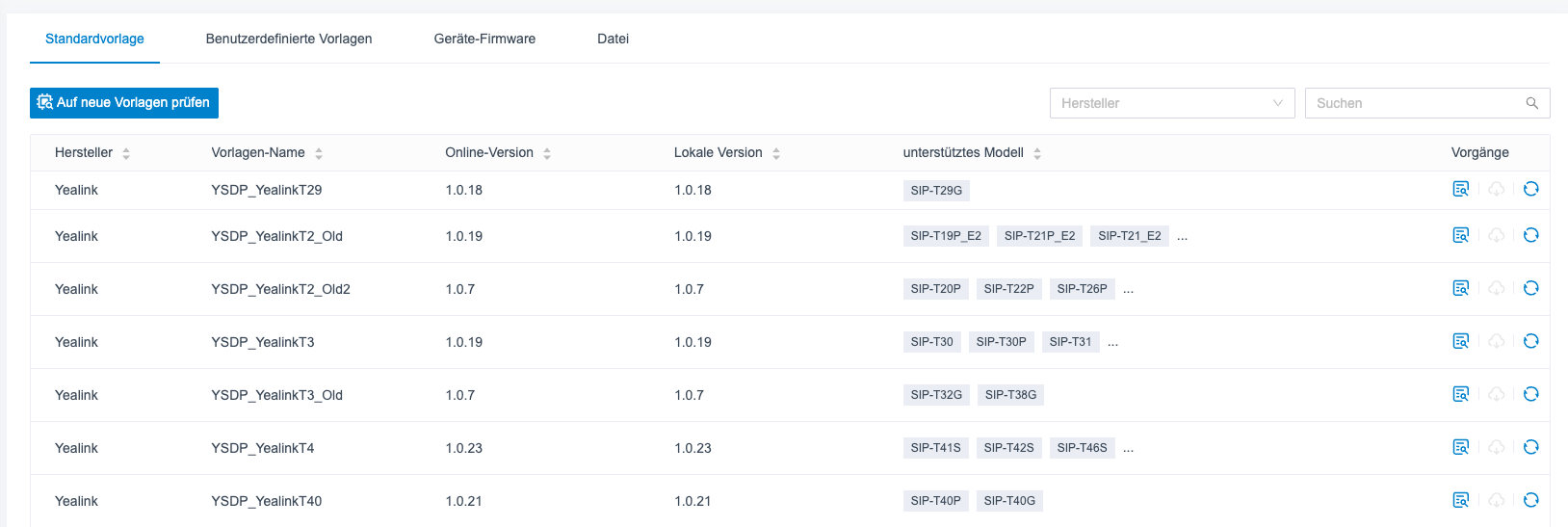 Die Pier4Voice bietet verschiedene Standardvorlagen für jedes unterstützte Gerät. Geräte unterschiedlicher Modelle können dieselbe Vorlage verwenden. Zum Beispiel gilt die Vorlage YSDP_YealinkT5xS von Yealink für Yealink T52S und T54S.