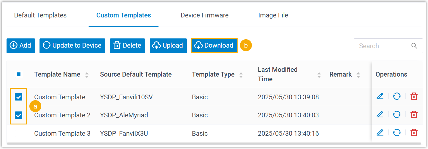 Um die Konfiguration mehrerer Vorlagen zu aktualisieren, aktivieren Sie die Kontrollkästchen der gewünschten Vorlagen und klicken Sie auf Update to Device (Auf Gerät aktualisieren).