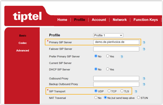 - Primärer SIP-Server : Geben Sie den Domänennamen der Telefonanlage ein.
