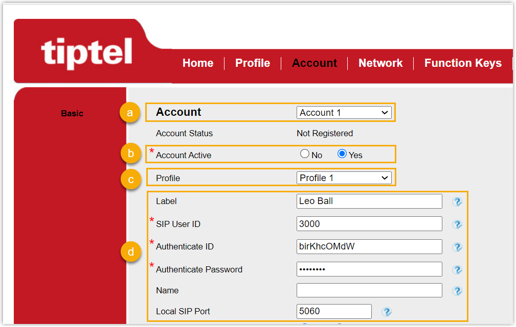 - Bezeichnung : Geben Sie den Namen ein, der mit dem Konto verknüpft ist und auf dem Telefonbildschirm angezeigt werden soll.