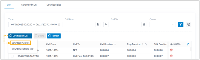 - Um alle Anrufprotokolle herunterzuladen, wählen Sie in der Dropdown-Liste „CDR herunterladen“ die Option „Alle CDR herunterladen“ .