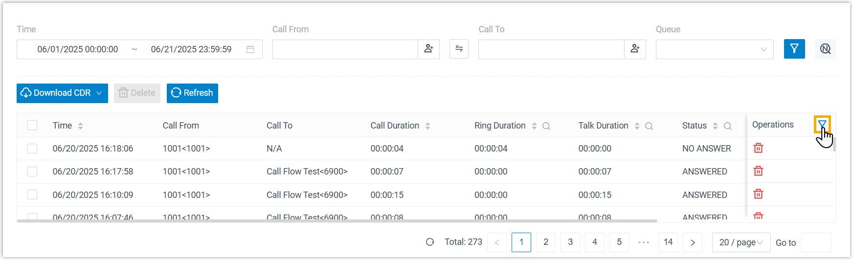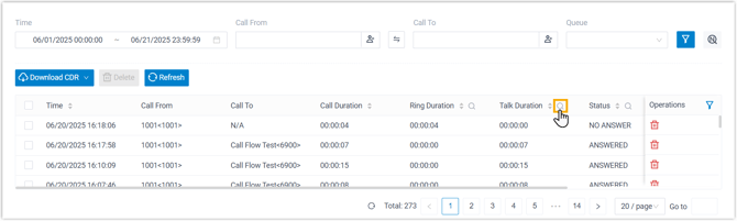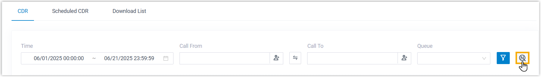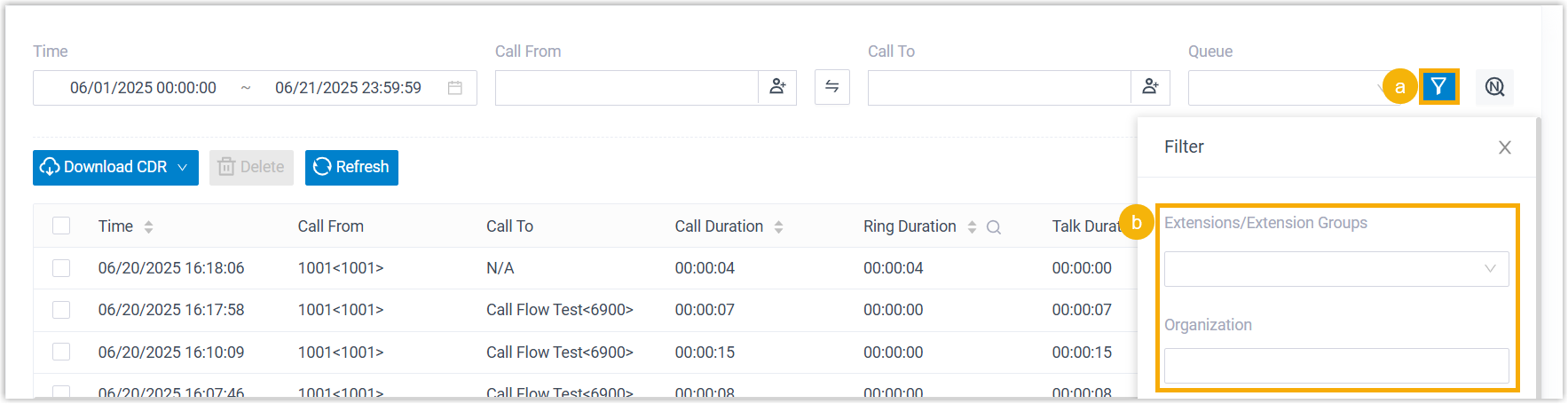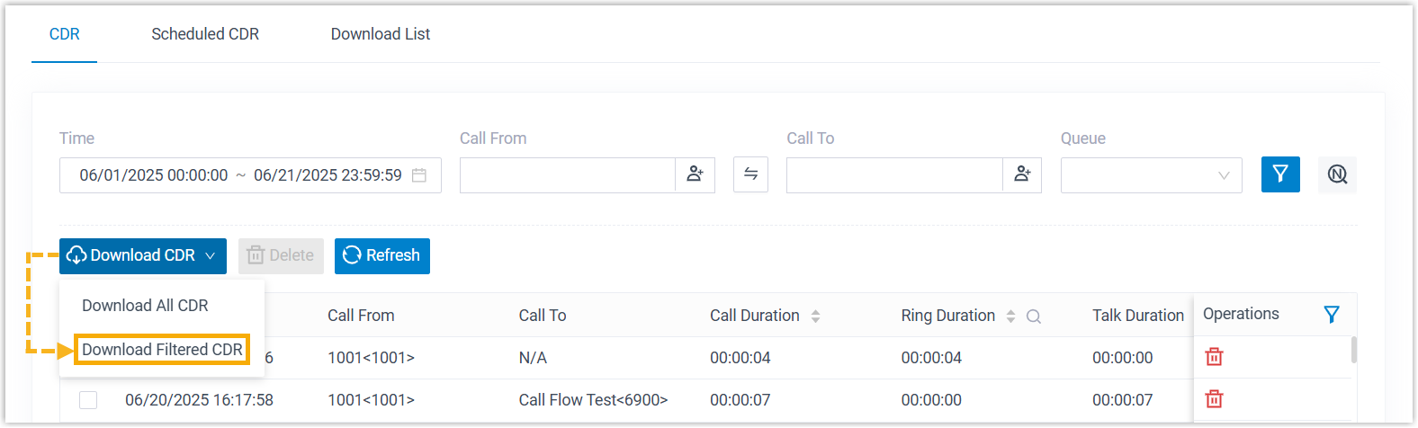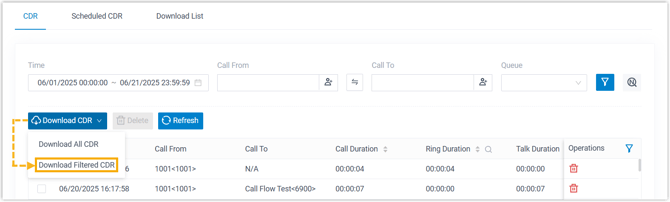 - Um die gefilterten Anrufprotokolle herunterzuladen, legen Sie die Filterkriterien fest und wählen Sie in der Dropdown-Liste „CDR herunterladen“ die Option „Gefilterte CDR herunterladen“ .