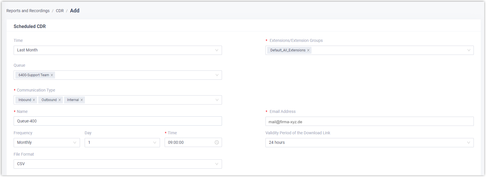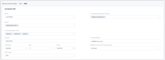 Das System sendet den CDR jeden Monat am ausgewählten Tag und zur ausgewählten Uhrzeit.