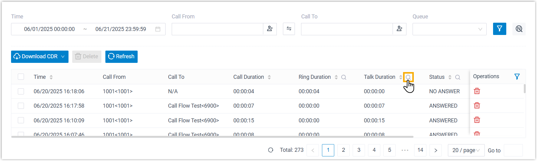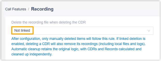 Notiz:Standardmäßig werden auch die zugehörigen Aufzeichnungsdateien gelöscht. Um nur den CDR zu löschen, können Sie die Einstellung „ Aufzeichnungsdatei beim Löschen des CDR löschen“ auf „Nicht verknüpft“ ändern (Pfad: Anruffunktionen > Aufzeichnung ).