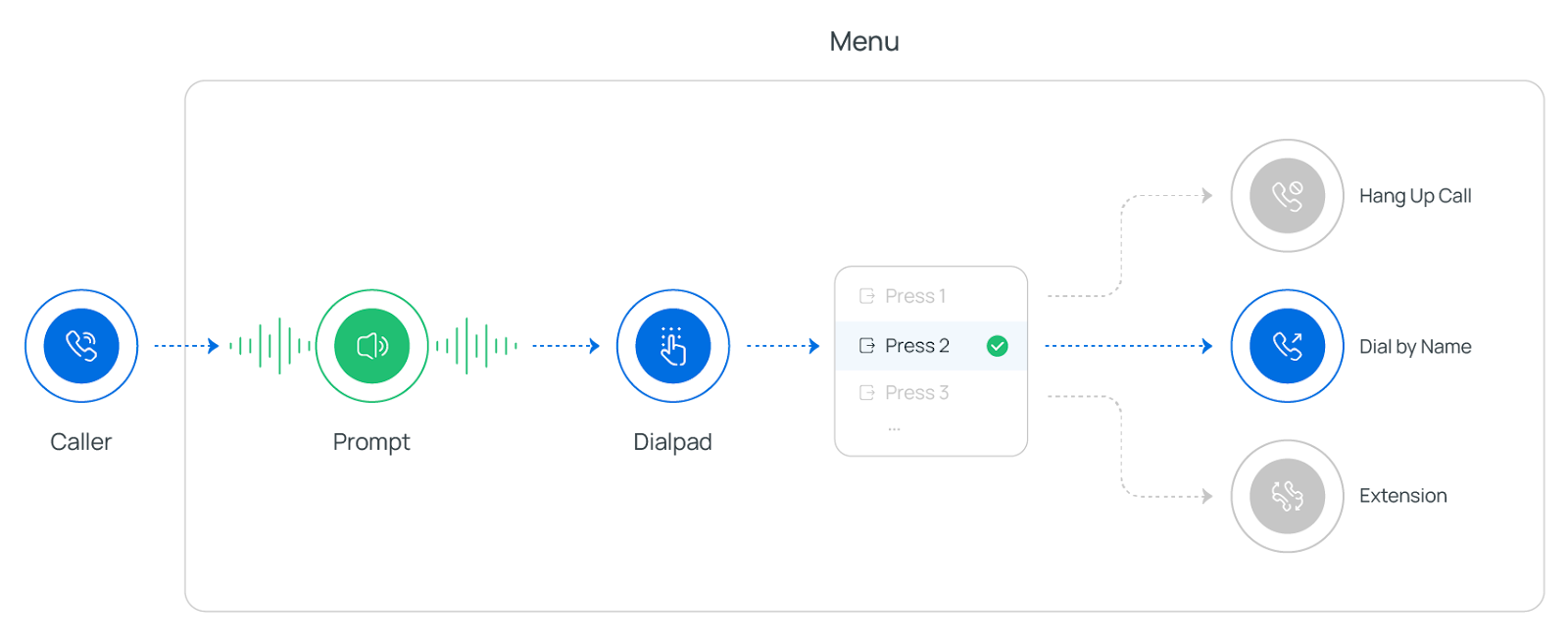 Die Menü-Komponente verfügt über zwei integrierte Zweige – Ungültige Eingabe und Antwort-Timeout – und unterstützt bis zu 100 zusätzliche Zweige für DTMF-Tasten. Jeder Zweig kann mit einer der gegebenen Komponenten verbunden werden, um Anrufe weiterzuleiten oder entsprechende Aktionen auszulösen.