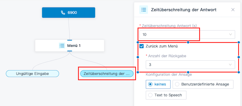 - Gib im Feld Antwort-Timeout (s) an, wie lange auf die Bedienung durch den Anrufer gewartet werden soll. Du kannst einen Wert aus der Dropdown-Liste auswählen oder einen Wert zwischen 1 und 9999 eingeben.