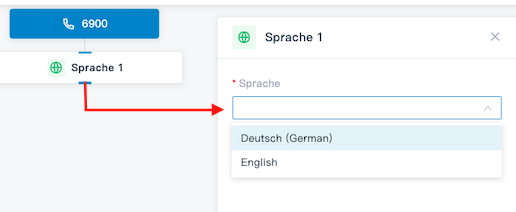 Nachdem du einen CallFlow eingerichtet hast, spielt das System standardmäßig Ansagen auf Englisch ab. Mit der Sprach - Komponente kannst du die Sprache der Systemansagen für nachfolgende Komponenten im Anrufverlauf ändern und so die Standard-Spracheinstellung überschreiben.