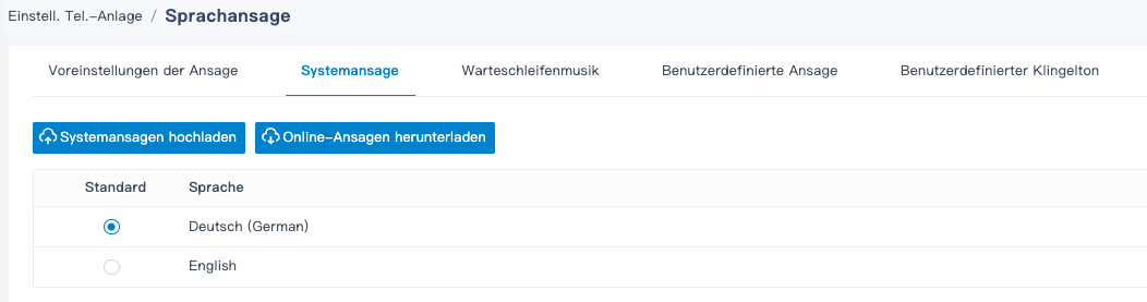 Standardmäßig ist nur Englisch verfügbar. Um eine andere Sprache zu verwenden, lade die gewünschte Sprache unter “Einstell. Tel.-Anlage” > “Sprachansage” > “Systemansage” herunter, bevor du die Komponente konfigurierst.