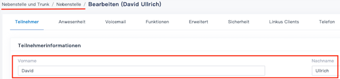 Lege den Namen der Anrufer-ID für die Durchwahl fest. Gehe zu “Durchwahl und Trunk” > “Durchwahl”, bearbeite die gewünschten Durchwahlen. Gib im Abschnitt Benutzerinformationen den Vor- und Nachnamen des Benutzers ein.