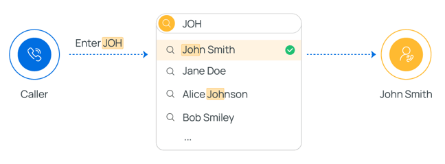 Die Komponente Wählen nach Namen ist eine der Endkomponenten, um die Verbindung des Anrufers zum aktuellen CallFlow zu beenden. Sie ermöglicht es Anrufern, einen Durchwahl-Benutzer zu erreichen, indem sie die ersten drei Buchstaben des Namens des Benutzers eingeben.