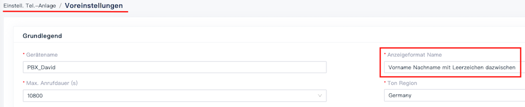 Lege das Anzeigeformat für den Namen der Anrufer-ID der Durchwahl fest. Gehe zu Einstell. Tel.-Anlage > Einstellungen. Wähle in der Dropdown-Liste Format der Namensanzeige ein Anzeigeformat aus.