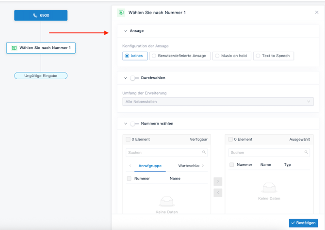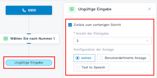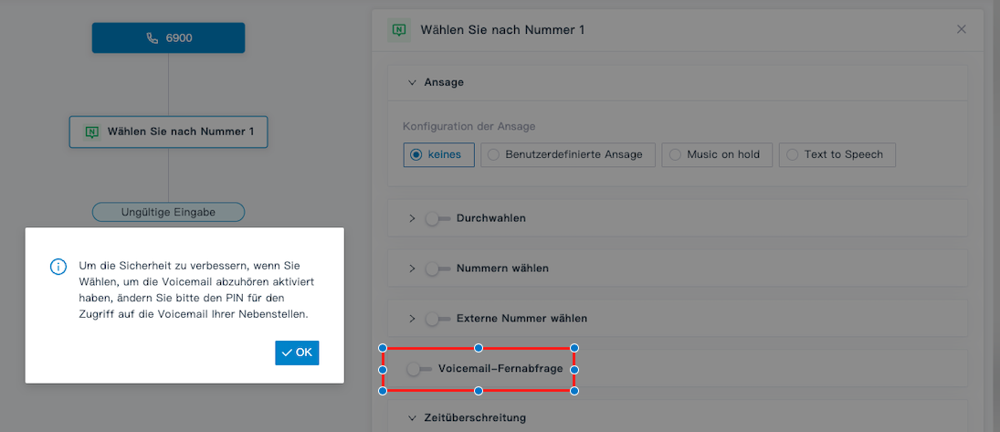 Optional: Konfiguriere Audio-Ansagen oder eine Text-zu-Sprache-Nachricht, um Anrufer zum erneuten Wählen aufzufordern.