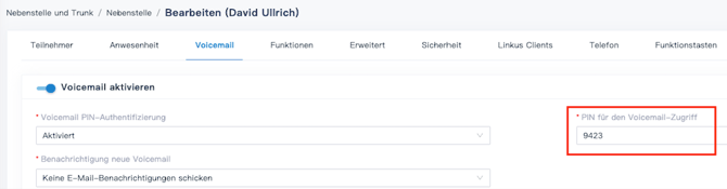 Um die PIN der Nebenstelle zu ändern, gehe zu Durchwahl und Trunk > Durchwahl > Voicemail > Voicemail-Zugangs-PIN