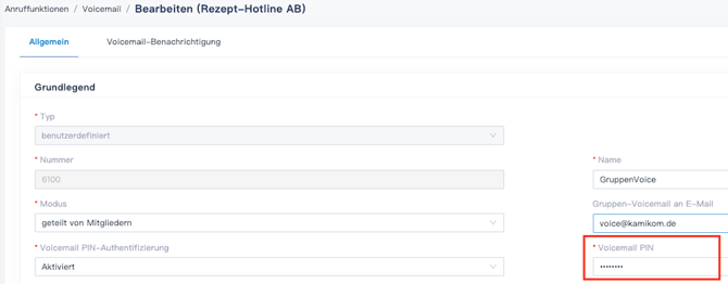 Um die PIN zu ändern, gehe zu Anruffunktionen > Voicemail > Gruppen-Voicemail > Voicemail-Zugangs-PIN.