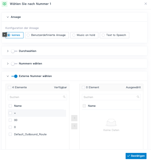 Hinweis: Es werden bis zu 5 benutzerdefinierte Ansagen unterstützt. Um aus einer bestehenden Ansage zu wählen, wähle sie aus der Dropdown-Liste Ansage aus.
