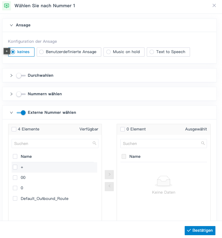 Die Komponente Wählen nach Nummer ermöglicht es Anrufern, direkt eine Nummer zu wählen, um ein Ziel zu erreichen. Du kannst festlegen, wann das System die Eingabe des Anrufers beendet – entweder bei Erreichen der Zifferneingabe oder wenn der Anrufer eine Endetaste drückt. Zusätzlich können Audio-Ansagen oder eine Text-zu-Sprache-Nachricht eingestellt werden, um den Anrufer zur Eingabe aufzufordern.