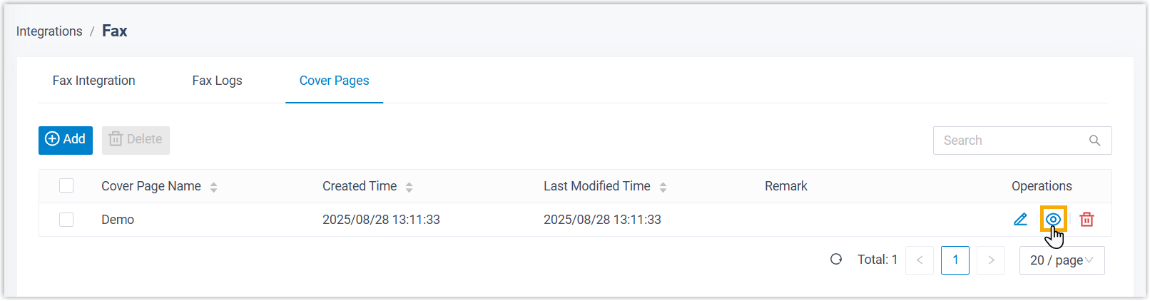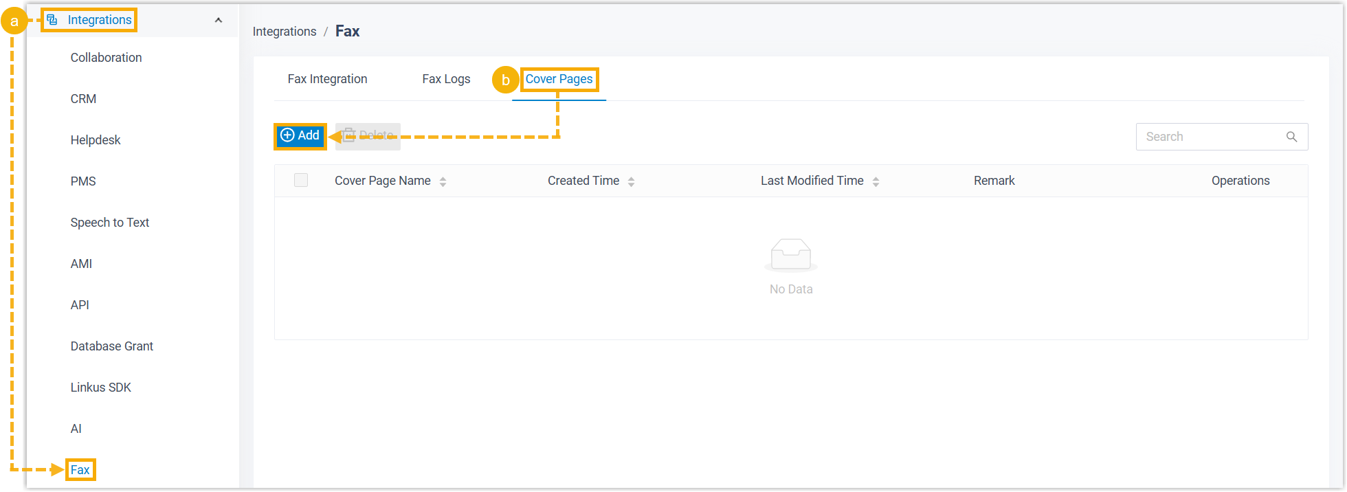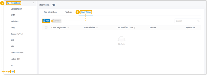 - Melden Sie sich im PBX-Webportal an und gehen Sie zu Integrationen > Fax > Deckblätter