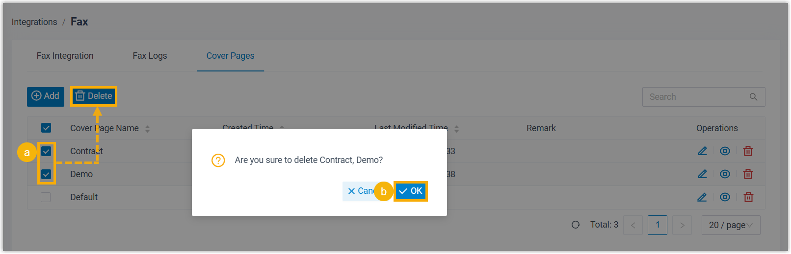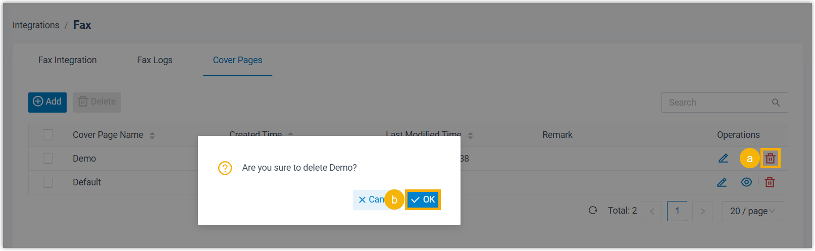 Sowohl Administratoren als auch Nebenstellenbenutzer können Faxdeckblätter löschen