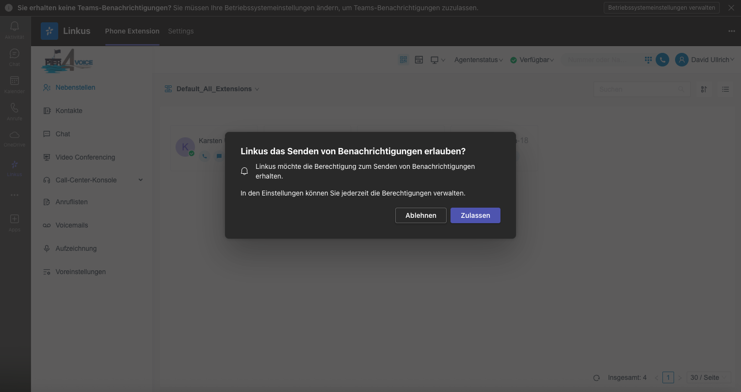 - Im Pop-up-Fenster können Sie entscheiden, ob Pier4Voice Linkus Ihnen Benachrichtigungen senden darf, wenn Sie Linkus-Chatnachrichten und -Anrufe erhalten.