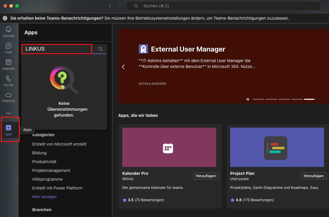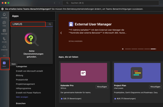 - Klicken Sie in der linken Leiste auf „Apps“ und suchen Sie nach Linkus.