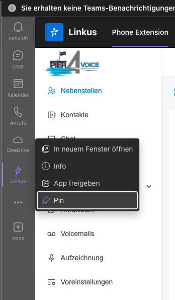 Pier4Voice Linkus ist in der linken Leiste Ihres Teams-Clients angeheftet.
