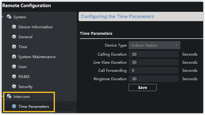 neben der Innenstation DS-KH6320, um zur Seite „Fernkonfiguration“ zu gelangen . - Gehen Sie zu Intercom > Zeitparameter , um die gewünschte Dauer im Feld Anrufdauer zu konfigurieren .