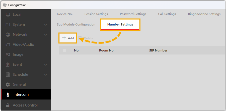neben der Türstation DS-KD8003, um zur Konfigurationsseite zu gelangen . - Gehen Sie zu Intercom > Nummerneinstellungen und klicken Sie auf Hinzufügen , um die Innenstation als Intercom-Gerät hinzuzufügen.