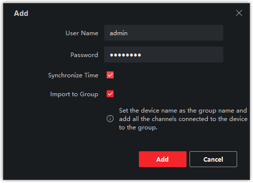 - In Gruppe importieren : Aktivieren Sie die Option, um eine Gruppe anhand des Gerätenamens zu erstellen und alle Kanäle des Geräts in diese Gruppe zu importieren.