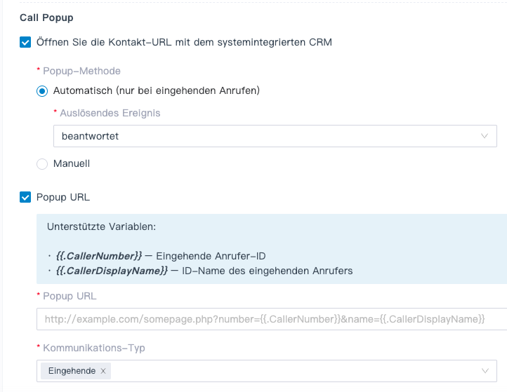 - Pop-up-URL: Gib die URL des Drittanbieters ein, gefolgt von den Variablen für die Anruferinformationen.