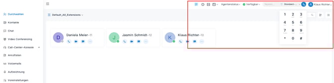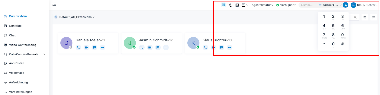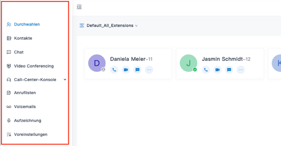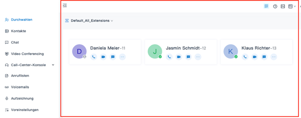 - Navigationsleiste: Am linken Rand findest du die wichtigsten Features. Hier kannst du zwischen deinen Nebenstellen, Kontakten, dem Chat, den Anrufprotokollen, Voicemails und den Einstellungen wechseln. Je nach Berechtigung hast du hier auch Zugriff auf erweiterte Funktionen wie das Operator Panel oder die Call Center Konsole.