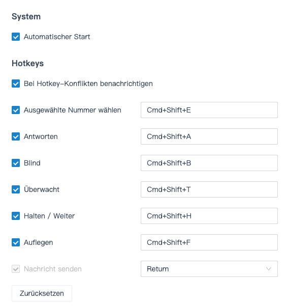 Standardmäßig ist die Tastenkombination für diese Funktion deaktiviert. Du musst sie in den Einstellungen des Linkus Desktop Client aktivieren.