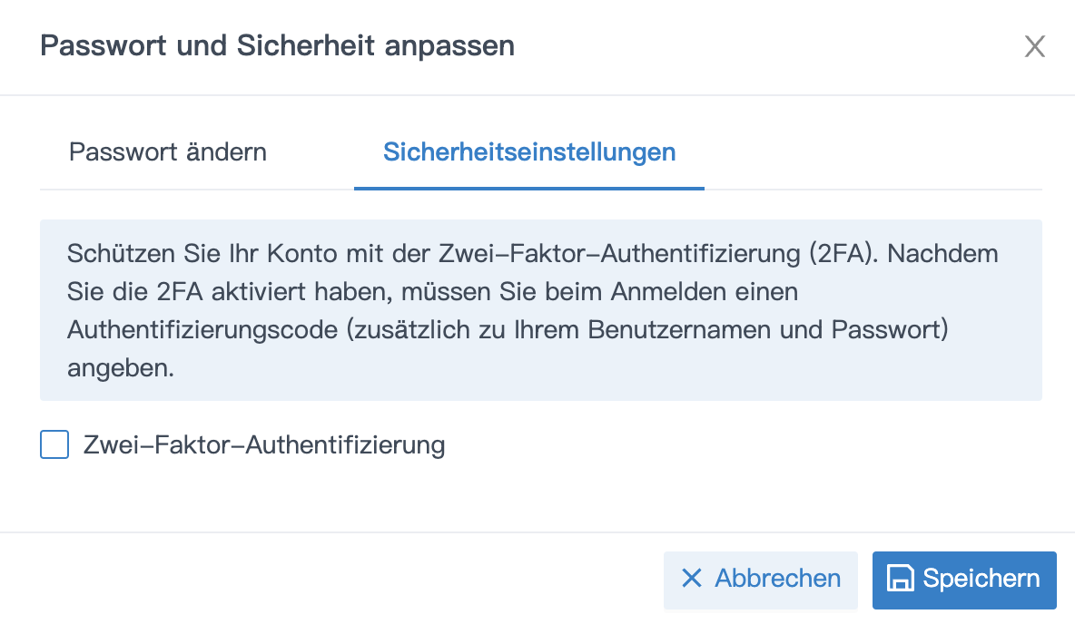 - Entferne das Häkchen bei Zwei-Faktor-Authentifizierung.
